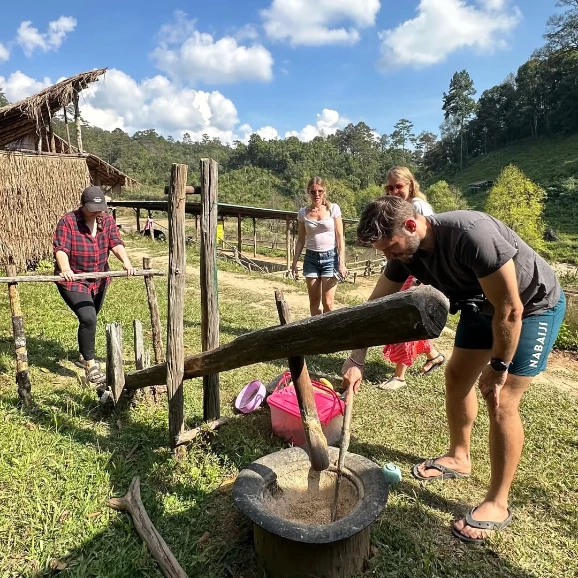 Half Day Afternoon Session begins with a pick-up from your Chiang Mai accommodation. Start on a scenic 1.5-hour drive through rural landscapes, where you can view flowing mountain rivers, lush rice fields, golden cornfields, and green banana plantations.